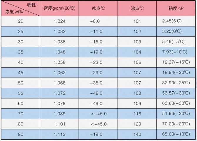 LM-4系列冰河冷媒由二元醇改性構(gòu)成,主要添加劑包括防腐蝕劑,防霉劑,增溶劑,水穩(wěn)劑等。外觀為淺色液體。安全低毒、無異味、不易燃、不易揮發(fā)。20℃時,原液密度為1.105~1.125g/cm',粘度為13.92mPa·s(cP),比熱為0.619cal/g℃,熱導(dǎo)率為0.26W/mK。沸點(diǎn)高于140℃,閃點(diǎn)高于120℃。