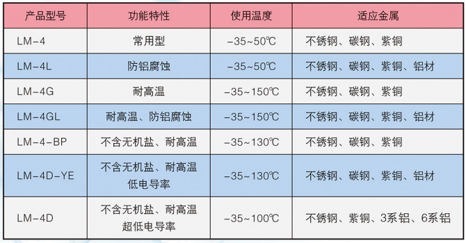 LM-4系列冰河冷媒具有低毒,不易燃,比熱大,安全穩(wěn)定,載冷能力強(qiáng)等優(yōu)點(diǎn)。對碳鋼、不銹鋼、紫銅等金屬防銹性能優(yōu)良。在不同濃度條件下,可以在很寬的溫度范圍內(nèi),廣泛應(yīng)用于各種制冷系統(tǒng)。使用時,根據(jù)具體工藝溫度要求單獨(dú)使用或用水稀釋成適當(dāng)濃度后應(yīng)用。如與醇類載冷劑混合使用,應(yīng)加入適量的冰河冷媒增效劑。其中: