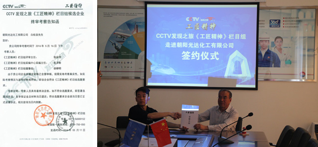 我公司提交的CCTV發(fā)現(xiàn)之旅《工匠精神》資料通過審核,5月11日收到CCTV發(fā)現(xiàn)之旅終審告知函,欄目組于5月17日來我公司進(jìn)行實地考察并舉行了簽約儀式!